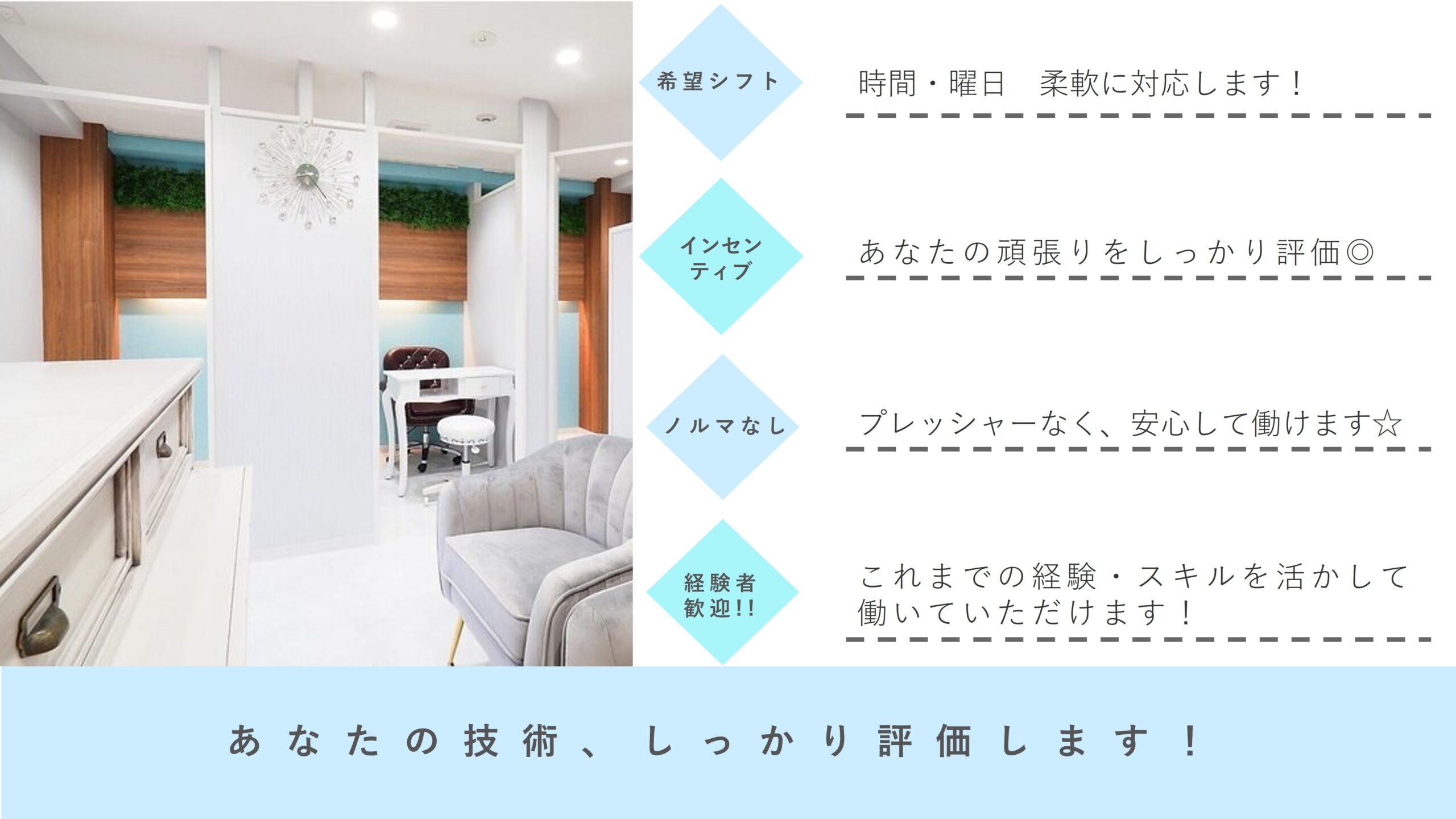 画面下部の応募フォームよりご応募いただいた後、担当者よりご連絡し、日程調整のうえ面接を実施いたします。面接は1回を予定しており、ご希望があればサロン見学も同日に対応可能です。面接後、早ければ数日以内に合否のご連絡を差し上げます。選考前に不安な点があれば、お気軽にお問い合わせください。